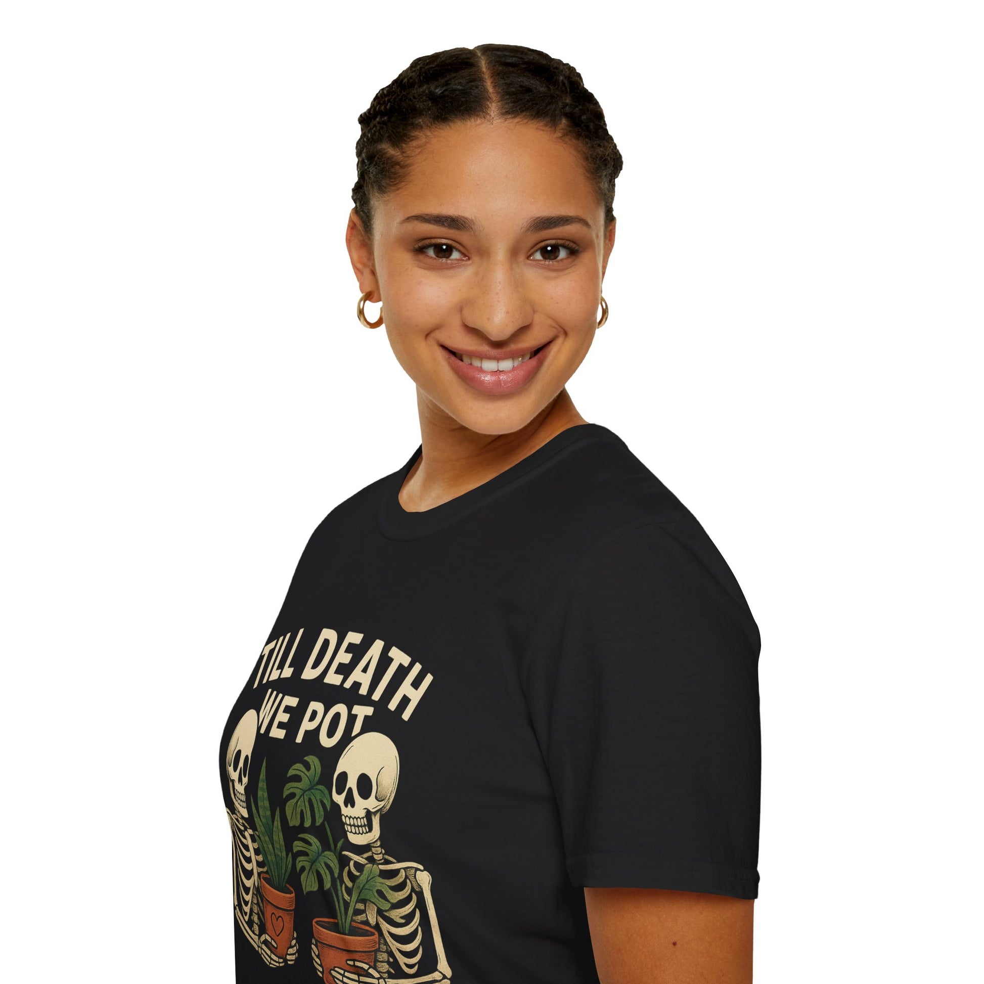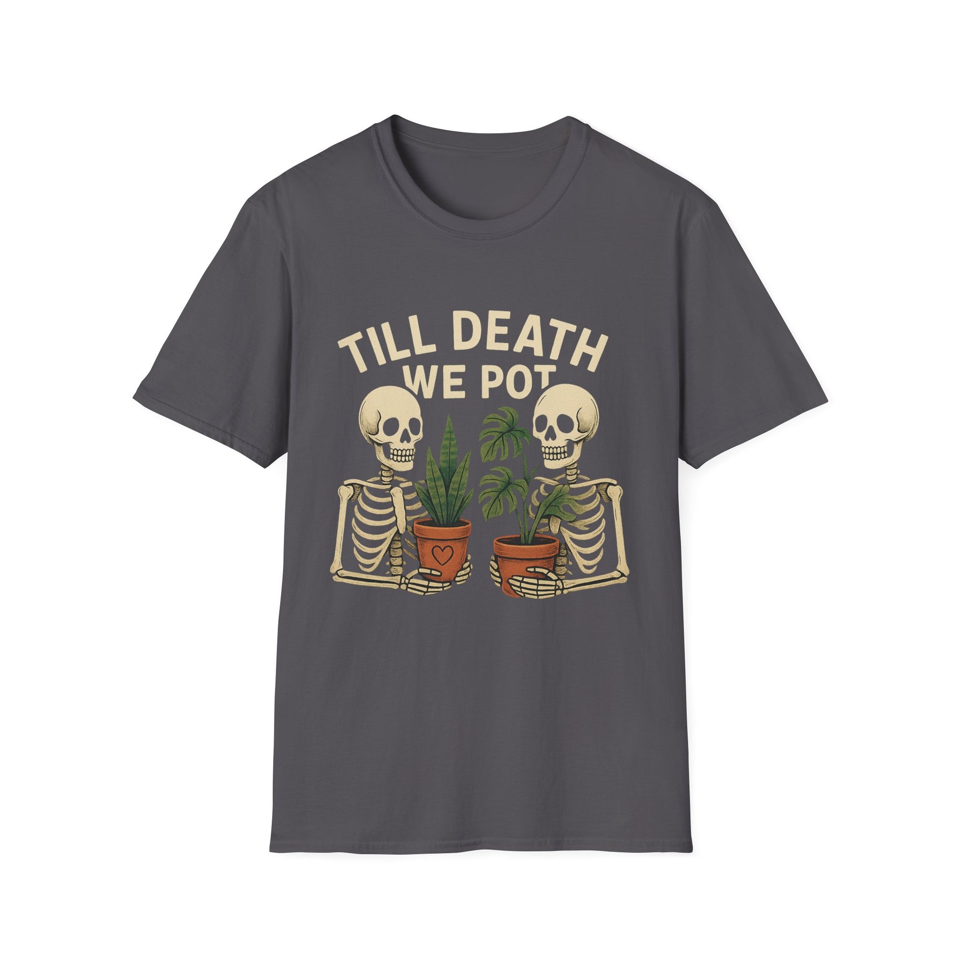 Introducing our unisex softstyle t-shirt, perfect for plant lovers and skeleton enthusiasts alike. This tee features a playful "Till Death We Pot" design, making it a great conversation starter or fun addition to any casual outfit. With its lightweight, breathable fabric, it's ideal for year-round wear, whether you're tending to your plants or enjoying a cozy night in. Its classic fit and crew neckline provide versatility, making it suitable for various occasions, from Halloween parties to casual gatherings with friends. This shirt is perfect for adults who appreciate quirky and humorous designs that reflect their love for nature and life’s adventures.